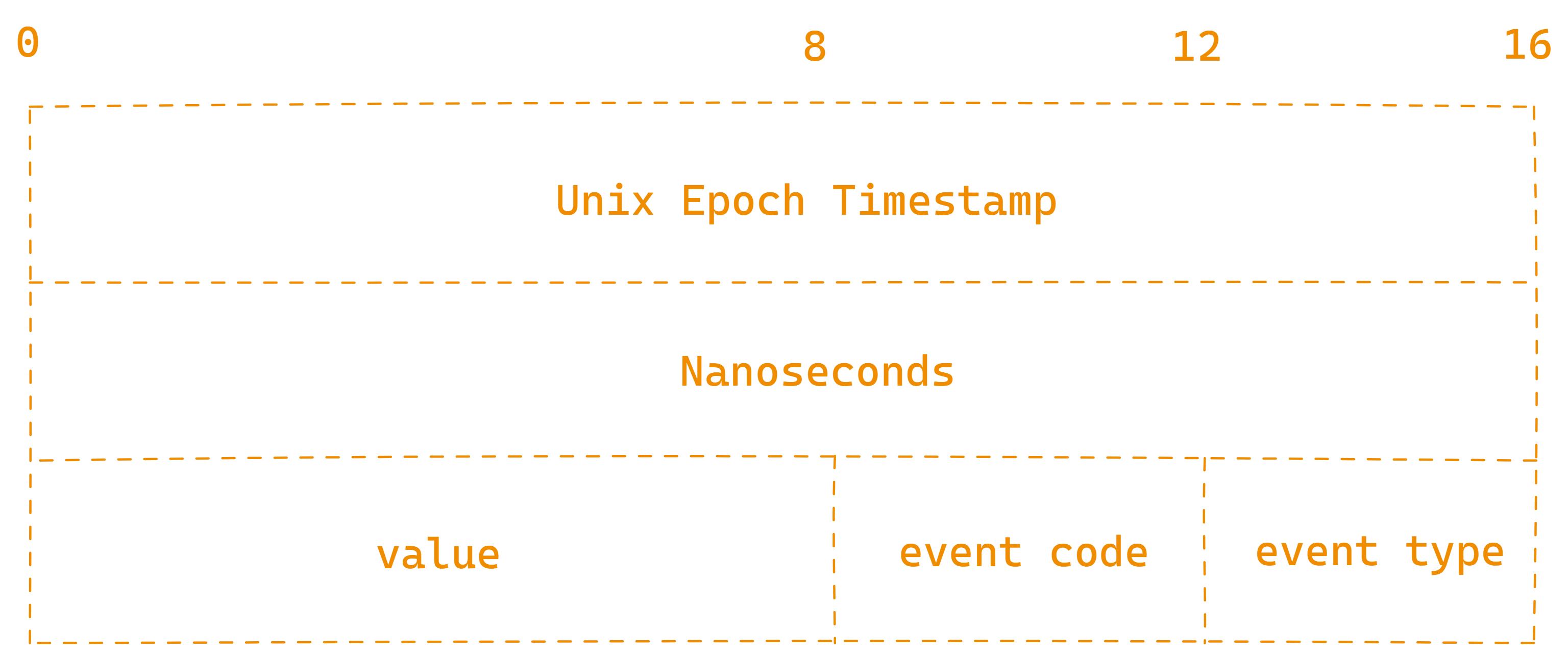 I can make out an integer which is the value field shown by evtest and 2 half-integer/short values which are the event code and the event type. And with that, we have fully understood what's on the wire.